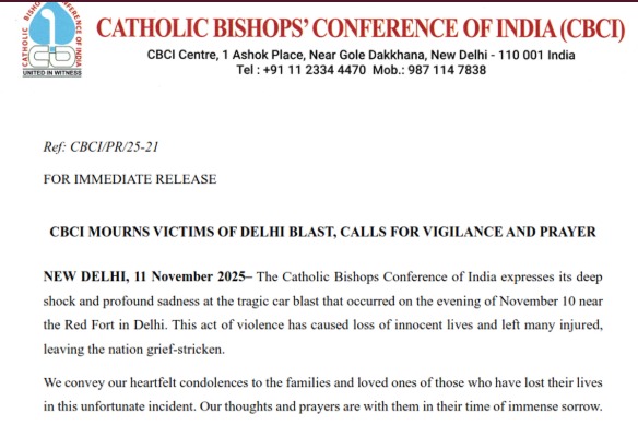 The Catholic Bishops’ Conference of India (CBCI) has expressed deep sorrow and grief over the deadly car explosion that struck near Delhi’s historic Red Fort on Monday evening. In a statement issued on Tuesday, the bishops conveyed their heartfelt condolences to the families of those who lost their lives, assuring them of the Church’s prayers and support. “Our thoughts and prayers are with the victims and their loved ones during this time of great pain. We also pray for the swift recovery of those who were injured,” the statement said.